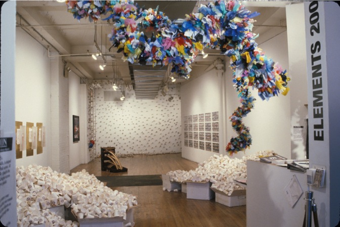 Consisting mostly of sculptural installations, ‘Elements 2000’ was mounted at seven participating sites in conjunction with the Women’s Caucus for Art and the 88th Annual College Art Association conference. Curated by Devorah Sperber and Jane Ingram Allen, each work in the show was to contain at least 2,000 separate elements. The seven venues, including Snug Harbor Cultural Center, P.S. 122, Ernest Rubenstein Gallery,Cave in Brooklyn, and HereArt in SOHO. are diverse spaces, both public and private.