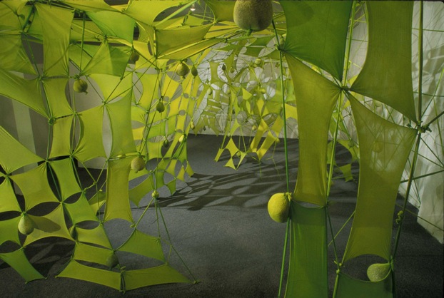 “Thomas has been known to literally spin her artistic webs....While advance planning for the basic structure of her free-form sculpture is important, the artist finds herself working spontaneously with the architecture of the space of where her work will be exhibited....stretching and knotting brightly colored nylon to create a sight-specific sculpture that will make your eyes dance. “