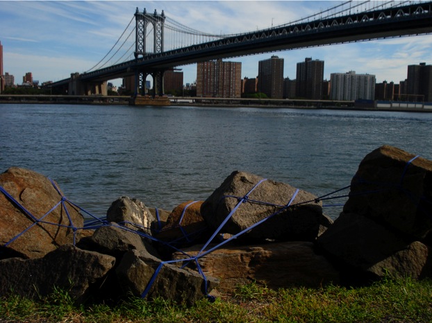 The Large Rocks along the park walkway inspired me to investigate the notion of ‘grey space’ - that space between what we know and what we imagine. The rocks are off-limits to the public, creating a barrier between the land and the water. With special permission from the Parks Department, I scrambled among the boulders, creating a web around and between the rocks lining walkway and the river. By wrapping them in a cobalt blue web of stretch nylon, I also called attention to their shape and beauty often overlooked in this popular and dramatic setting.