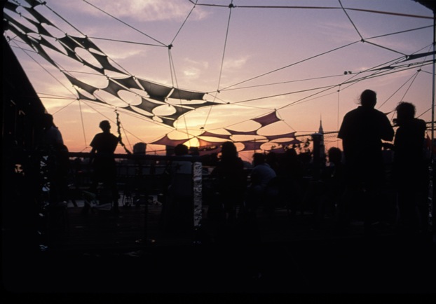 Judy Thomas creates an unique and compelling outdoor stage on an urban rooftop. ...A multi-media end of summer extravaganza in industrial Greenpoint. with poetry and music set against the elaborate backdrop of a sculptural installation. It is difficult to say which is more compelling - the Manhattan skyline or the art.