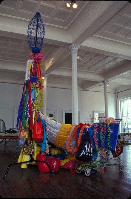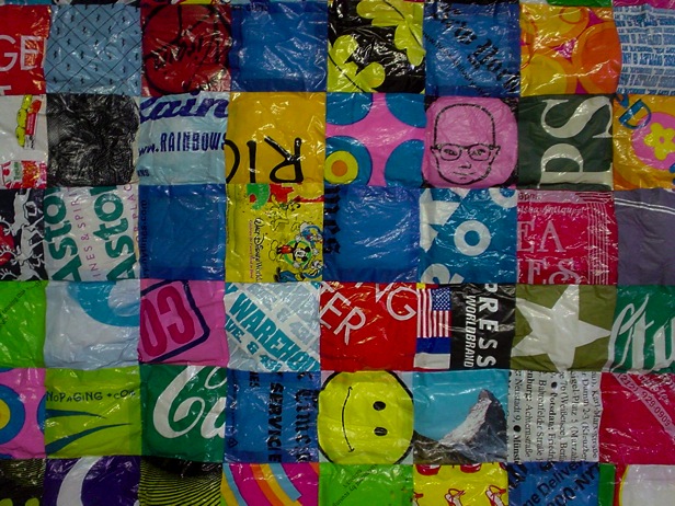 ‘Quilt’ is a monumental construction conceived of with the urban homeless populations in mind. Plastic bags the ubiquitous fabric of our daily urban existence, are transformed by Thomas into the vocabulary of Comfort. They are literally sewn into a quilt, or ‘comforter’, to ease the pain, to keep warmth in, to see in refuse the potential for caring and responsiveness. Humorous and delightful with references to “Pop” art, this colorful and painterly ‘soft’ sculpture addresses many issues simultaneously.