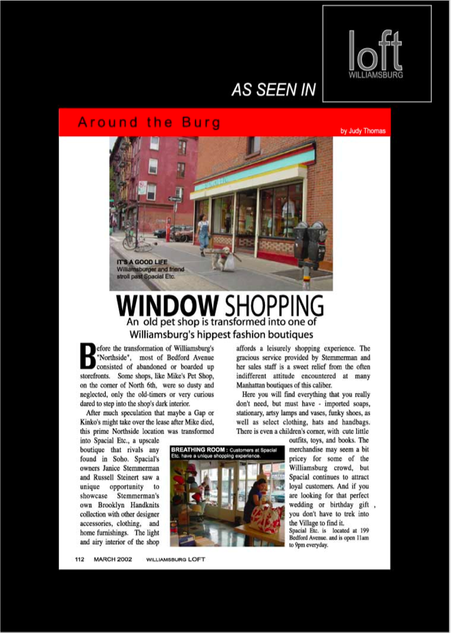 In this challenge, I created an editorial review of the trendy Bedford Avenue boutique Spatial, Etc., for the imagined glossy magazine ‘Williamsburg Loft’. The editorial ‘tear sheet’ was placed, placard style, in the store window. The intent was to draw subtle attention to the boutique, while not interfering with its window display and cool designer aesthetic